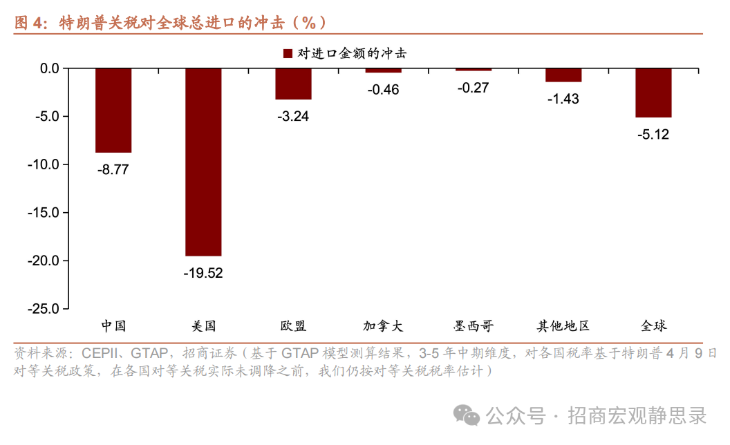 出口:3-5年维度下美国出口累计总额较基线下降17.40%,5年维度下中国、欧盟、加拿大、墨西哥、其他地区出口累计总额分别较基线下降12.54%、3.70%、0.54%、0.62%、1.76%,进而,3-5年维度下全球出口累计总额较基线下降5.09%。
