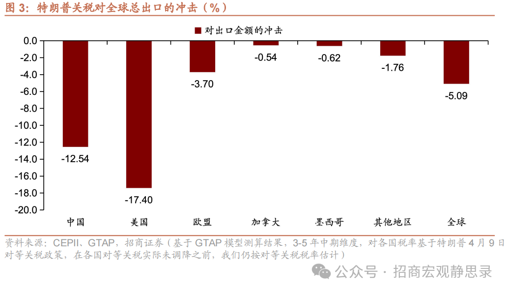 增长:3-5年维度下美国实际GDP累计总额较基线下降5.97%,中国、欧盟、加拿大、墨西哥、其他地区5年维度下实际GDP累计总额分别较基线下降2.86%、1.86%、0.46%、0.21%、0.77%,进而,3-5年维度下全球实际GDP累计总额较基线下降2.49%。