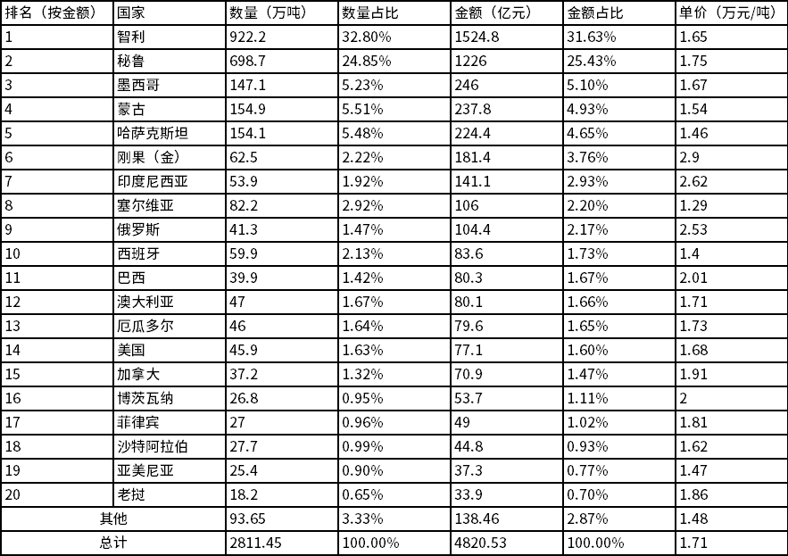 拉美是中国铜精矿进口最主要的来源地,合计进口量达到1867万吨,占中国全年铜精矿进口总量的66.4%;蒙古和中亚地区也是我国铜精矿进口的中亚来源地,合计进口309万吨,占比11.0%。其他区域,从欧洲进口189万吨(主要是俄罗斯和塞尔维亚),占比6.7%;从美加澳三国进口130万吨,占比4.6%;从非洲进口129万吨,占比4.6%;从东盟进口102万吨,占比3.6%;从中东进口75万吨,占比2.7%。