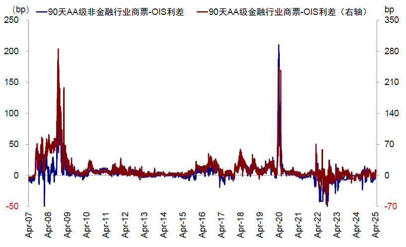3)商业票据市场(Commercial Paper):其中的一个重要功能是满足企业短期融资需求,通常为信用良好的金融或非金融企业发行,通常期限较短,由于货币市场基金是商业票据的主要投资者,因此商票利差的变化也一定程度上反映短期货币市场的流动性。通过商业票据利率与OIS利差可以衡量票据市场流动性。