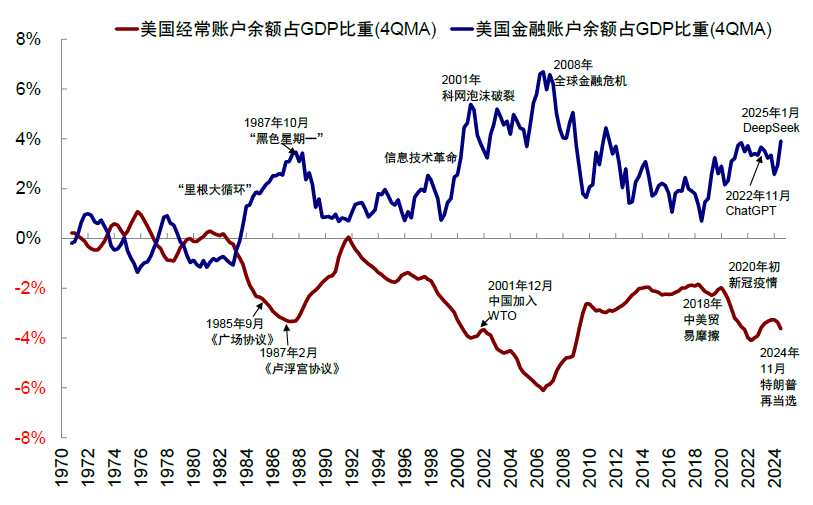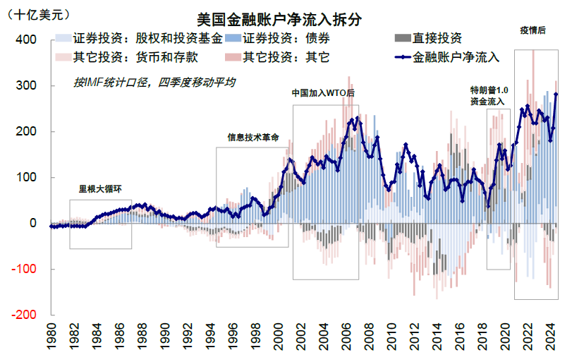 ► 过去资金流入美国离不开美元体系的信用。我们在《中美的“两本账”》中分析过,过去美国经常账户长期赤字,流向全球的美元通过金融账户回流,支撑美国经济和资产表现。而资金之所以流入美国,离不开美元资产的吸引力:1)要么就是产业趋势带来的美股吸引力,2)要么就是美债作为安全资产的吸引力,建立在美元储备货币地位和美元政府信用的基础上,尤其是全球化的大环境。