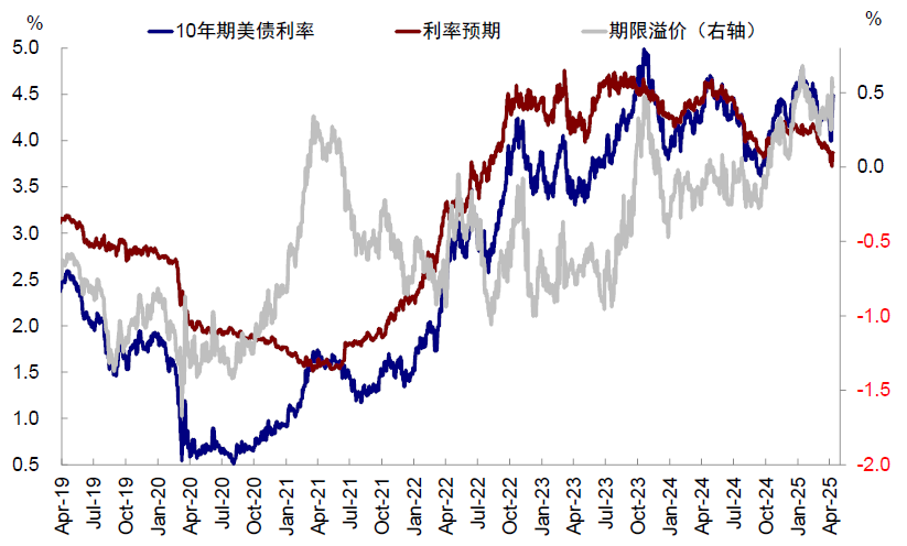 图表7:10年美债利率抬升主要由期限溢价而非利率预期贡献,反映对美债供需失衡的担忧