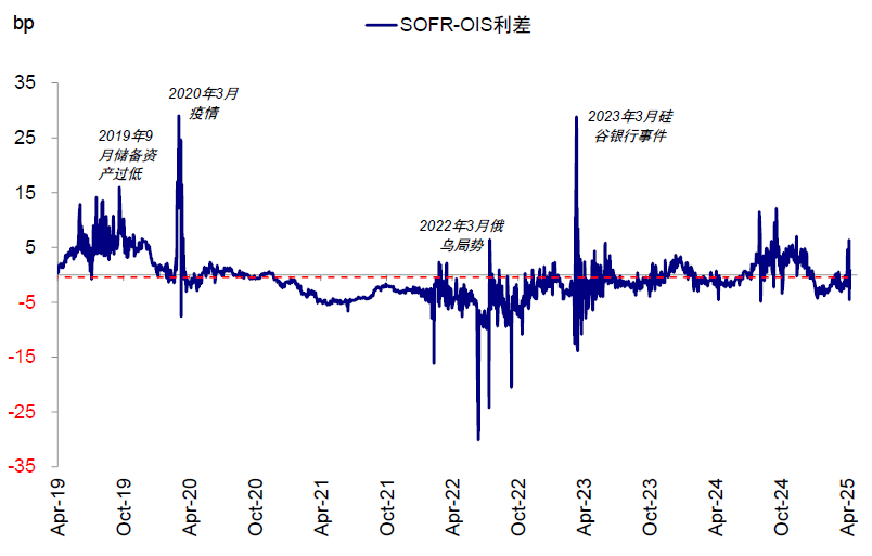 图表8:SOFR-OIS利差明显抬升,但距离2020年3月疫情和2023年3月硅谷银行事件仍有明显距离