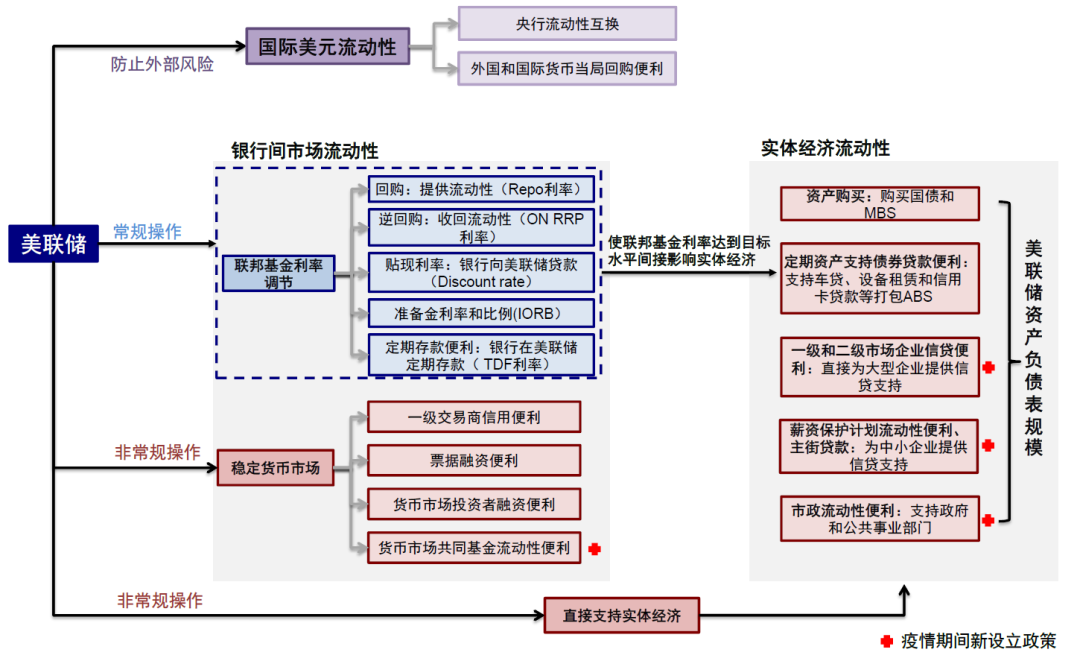 不过,若真的出现流动性危机,美联储也有充足的“工具”进行救助(图表22、图表23)(《美联储如何救市?详解历次危机中的应对》)。我们判断,如果出现流动性收缩的极端情形,美联储可能停止缩表甚至再启动QE,并针对局部流动性紧张的环节“对症下药”、定点投放流动性,届时反而可能提供更好的介入时机。