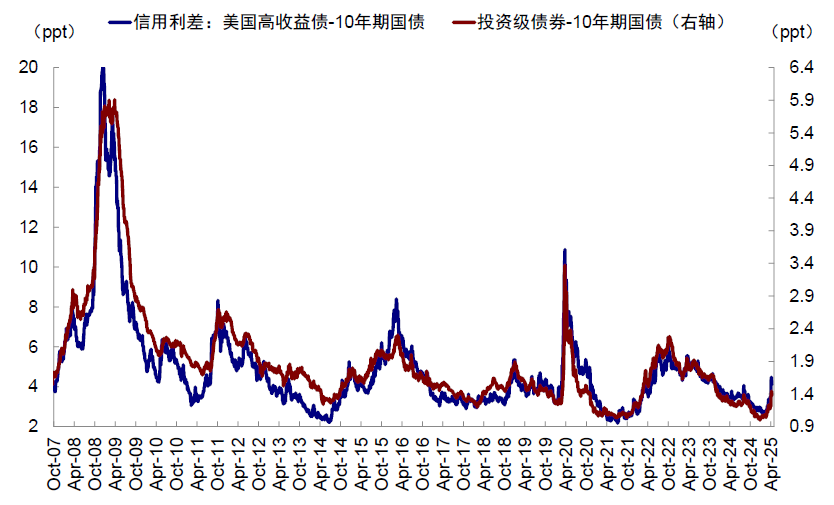4)信用债市场:信用利差的高低是衡量企业中长期融资成本的重要指标。该指标在2008年金融危机时达历史高点,对等关税宣布后高收益债和投资级债券利差都有所走阔,但仍低于2020年疫情和2008年金融危机水平(图表10)。