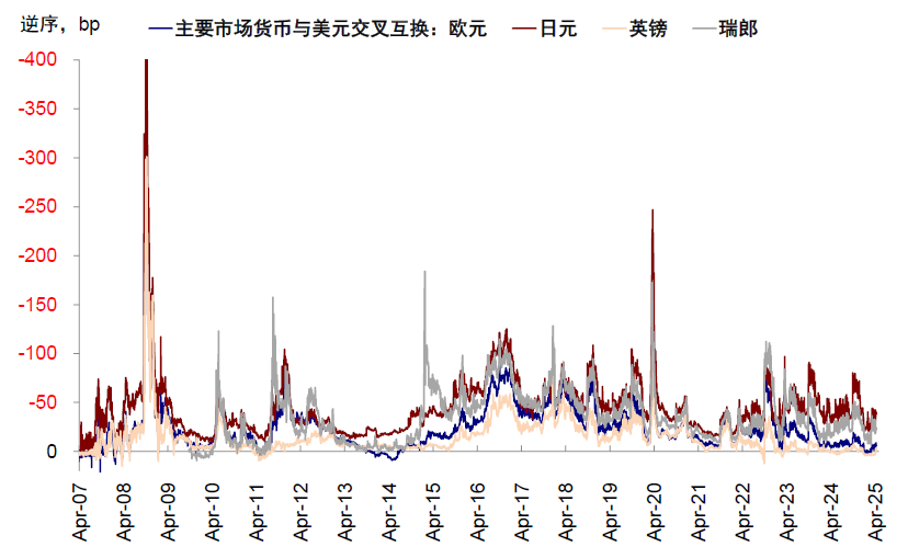 5)离岸美元流动性:主要市场汇率与美元的交叉互换基差是常用来衡量离岸美元流动性的重要指标,基差走阔体现为离岸美元市场的流动性稀缺。2008年金融危机爆发后全球资金涌入避险资产美元,使得离岸美元流动性稀缺,主要汇率与美元交叉互换攀升至历史高点。本次关税宣布后,主要货币与美元交叉互换小幅走阔,但由于美元走弱、资金“逃离”美元资产,使得离岸美元市场暂时相对稳定(图表11)。
