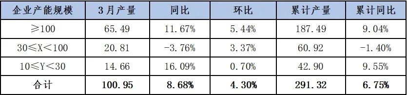 安泰科跟踪调研数据显示,2025年1-3月,24家样本企业(以集团公司为统计口径)累计生产阴极铜291.32万吨,同比增长6.75%,其中3月份产量为100.95万吨,同比增长8.68%,环比增长4.30%。年产能规模在100万吨以上的样本企业1-3月累计完成阴极铜产量187.49万吨,同比增长9.04%,3月合计完成产量65.49万吨,同比增长11.67%,环比增长5.44%;产能规模在30≤X<100万吨的样本企业1-3月累计完成阴极铜产量60.92万吨,同比下降1.40%,3月合计产量20.81万吨,同比下降3.76%,环比增长3.37%;产能规模10≤Y<30万吨的样本企业1-3月累计完成阴极铜产量42.90万吨,同比增长9.55%,3月合计产量14.66万吨,同比增长16.09%,环比增长0.70%。