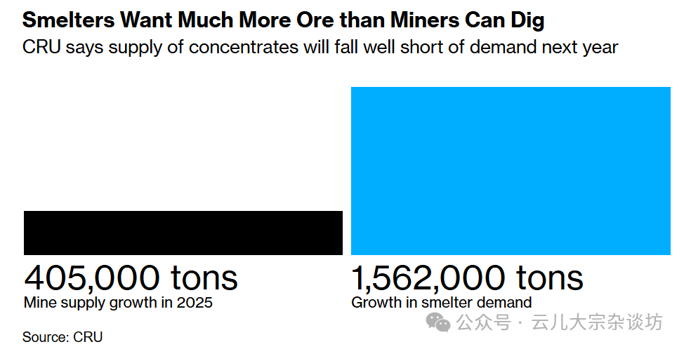 中国作为全球最大的铜冶炼国家,近年来新建和扩建冶炼产能迅猛,包括刚果(金)、印度、印尼在内的新兴国家也纷纷投产新厂,导致精矿供应严重紧张。CRU预测,2025年铜精矿的供应增长仅为40.5万吨,而全球冶炼厂对精矿的新增需求高达156.2万吨,供需缺口将达到120万吨,为至少十年来最大。
