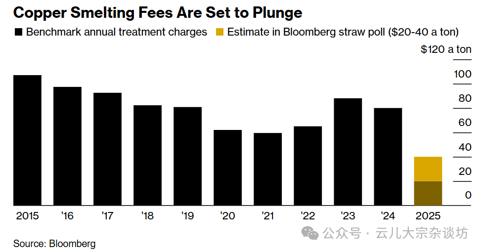 全球铜冶炼产业正经历前所未有的盈利压力。根据Bloomberg数据显示,2025年铜冶炼基准加工费(TC/RC)预计将从2023年的近90美元/吨暴跌至20–40美元/吨,为十年来最低水平。多个冶炼厂表示,在低于每吨35至40美元的水平下将面临全面亏损。