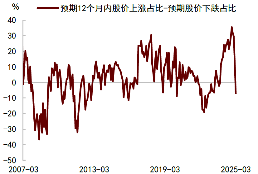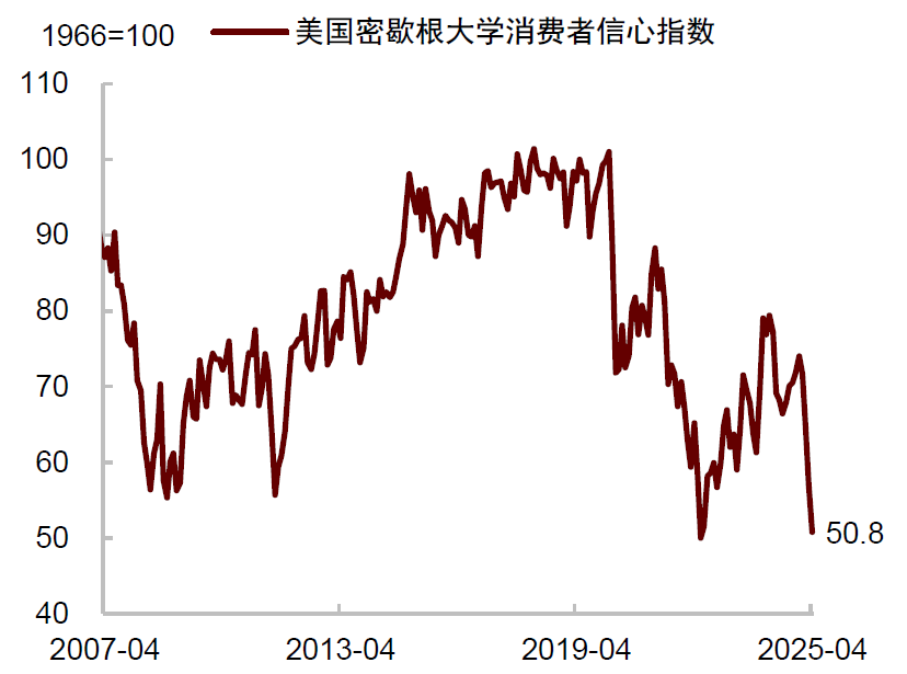 自特朗普加征关税以来,美国消费者信心持续下降,对未来就业和财富的预期越来越悲观。根据密歇根大学调查,2025年4月份消费者信心指数大幅下跌至50.8,已接近历史最低水平。根据纽约联储调查,消费者认为一年后美国失业率上升的平均概率飙升至44%,为2020年4月新冠疫情以来新高。近三分之一的家庭预计一年后的财务状况将更加糟糕,为近两年来的最高值。谘商会的调查显示,消费者对股票市场的预期不断走弱,预计未来12个月股价下跌的消费者比例自年初以来已大幅上升。