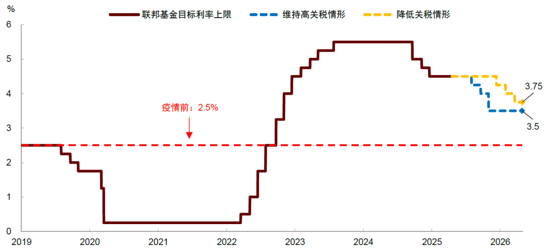 图表:美联储的两条降息路径:关税越高,降息越多