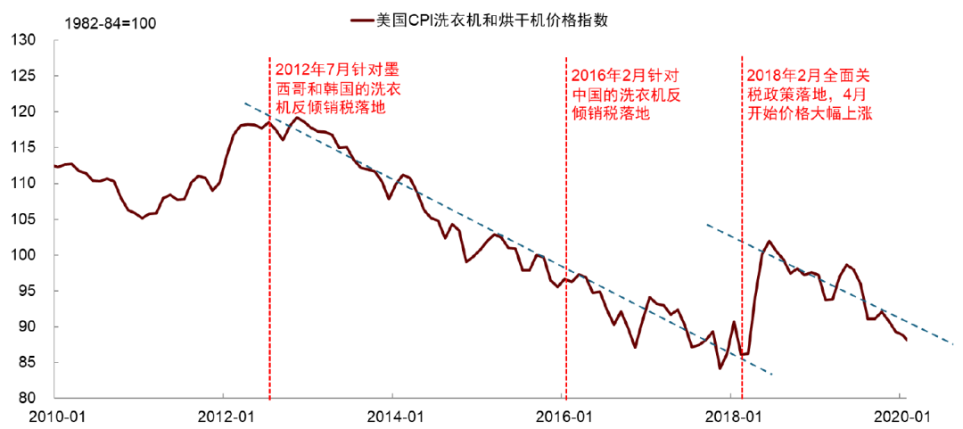一个案例是美国对进口洗衣机征收关税。2012-2018年,美国先后三次对进口洗衣机征收额外关税。其中,2012年和2016年分别对从墨西哥、韩国以及中国进口的洗衣机单独征收反倾销税,导致美国从这些国家进口洗衣机数量下降。然而,美国CPI篮子中的洗衣机价格并未上涨,这是因为消费者转向购买从泰国、越南进口的洗衣机,从而通过“国别转移”实现了替代效应。随后,2018年美国全面征收“保障关税”(safeguard tariffs)。由于几乎覆盖了所有洗衣机供应国,消费者难以寻找替代品,洗衣机价格指数跳升17%。