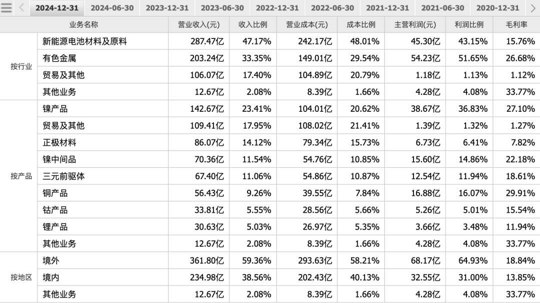 进一步聚焦到主营业务收入构成,不难发现镍产品及镍中间品成为了2024年公司营收的支柱,两项分别占比达23.41%和11.54%。同时,这两项业务毛利率也相当可观,分别高达27.10%和22.18%。