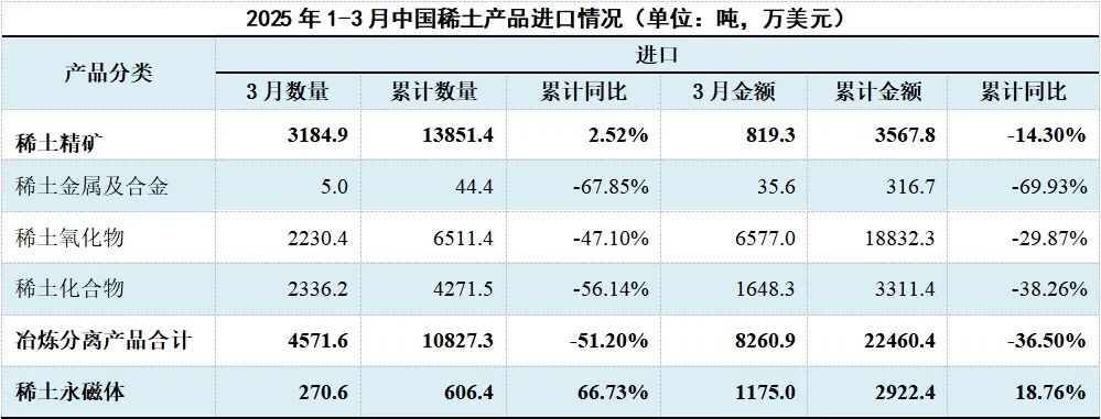 四、2025年1-3月稀土冶炼分离产品进口量同比下降51%