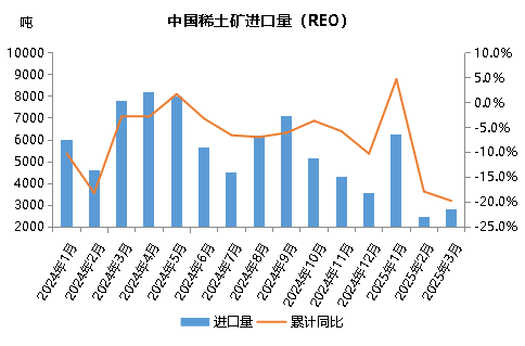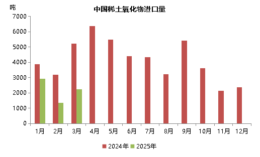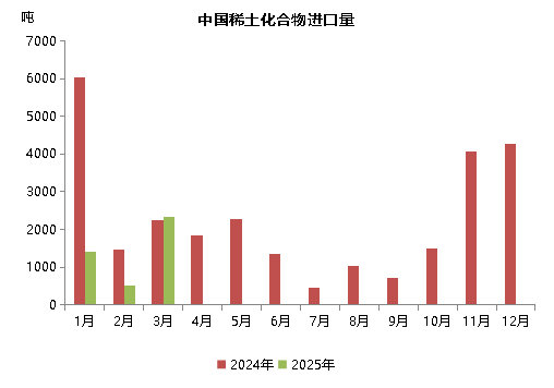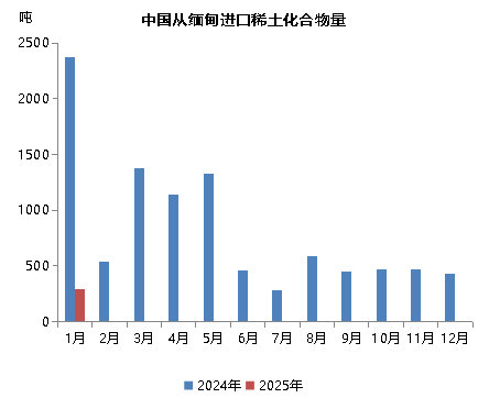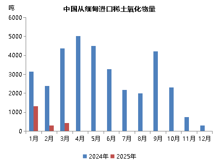 2024年以来,由于缅甸局势动荡,稀土原料进口受到较大影响,今年以来,这一情况仍然延续。2025年1-3月份,我国从缅甸进口2053吨稀土氧化物,同比下降79%,占同期氧化物总进口量的32%,进口品种全部为“未列名氧化稀土”;1-3月,我国从缅甸进口288吨稀土化合物(全部为1月份进口,2-3月份未进口),同比萎缩93%,占比降至6.7%,进口品种全部为“其他未列名稀土金属及其混合物的化合物”。据测算,2025年1-3月,我国从缅甸进口的稀土原料中(稀土氧化物和稀土化合物),REO总含量同比下降约80.7%。