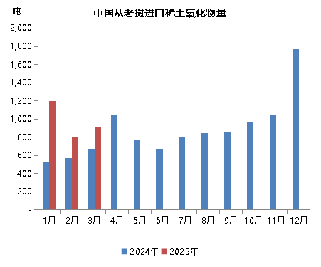 2025年1-3月,我国从老挝进口2905吨稀土氧化物,同比增长64%,占同期氧化物总进口量的44.6%,进口品种全部为“未列名氧化稀土”。同期未从老挝进口稀土化合物。