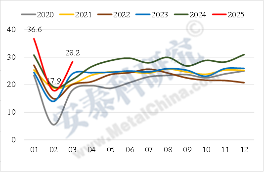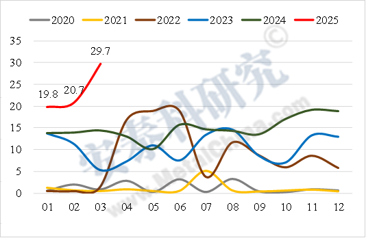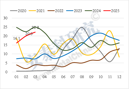 图3 2020-2025年我国原铝月度进口量(万吨)