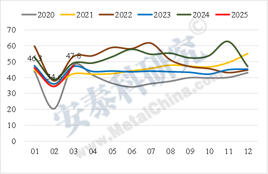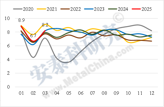 图5 2020-2025年我国废铝月度进口量(万吨)