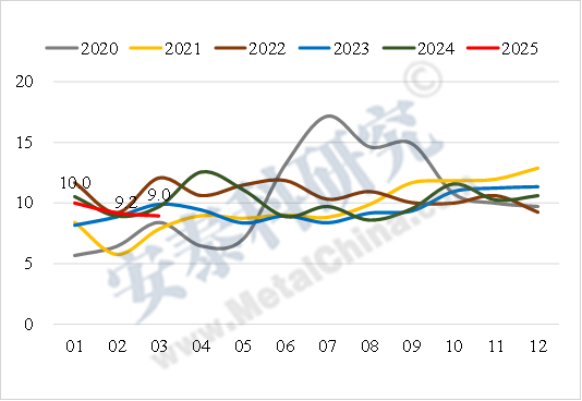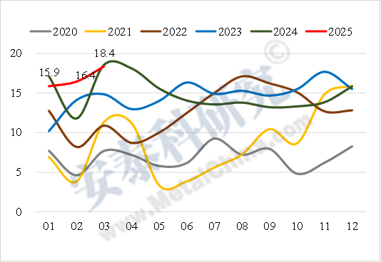 2025年3月,我国多数铝产品进出口环比增长,主要表现为:铝土矿进口增长;氧化铝出口增长,进口下降;原铝进出口均增长;铝合金进口下降,出口增长;废铝进口增长;铝材、铝制品和铝车轮出口均增长。