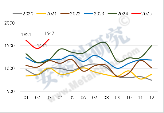 一、铝土矿进口环比增长。2025年年初以来,受自几内亚铝土矿进口大幅增长拉动,中国铝土矿进口持续保持高位。3月份铝土矿进口1647万吨,继1月后再次创下单月历史最高记录,环比增长14.2%,同比增长39.1%。其中,自几内亚进口1300万吨,突破1月的历史高点,环比增长21.2%,同比增长47.3%;自澳大利亚进口254万吨,环比增长7.3%,同比增长2.2%。铝土矿进口单价延续去年下半年以来的上涨趋势,3月份均价达到93.1美元/吨,环比增长4.8%,同比增长41.9%。