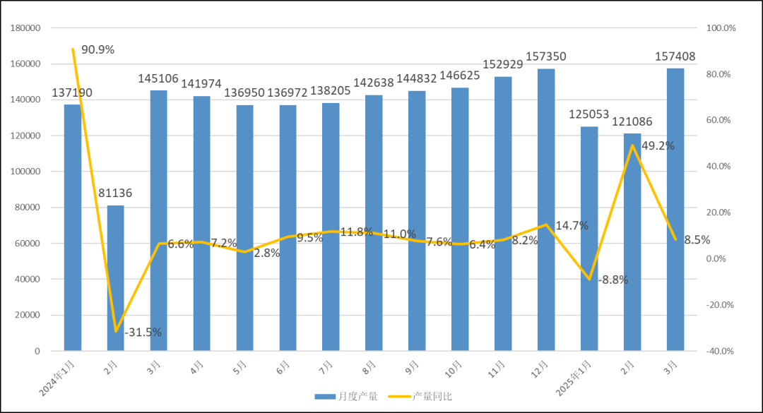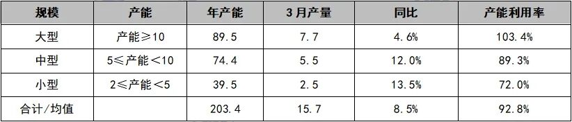 表1 2025年3月份调研企业产能产量统计 单位:万吨