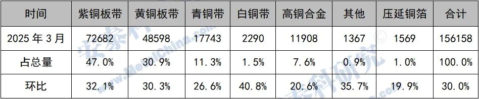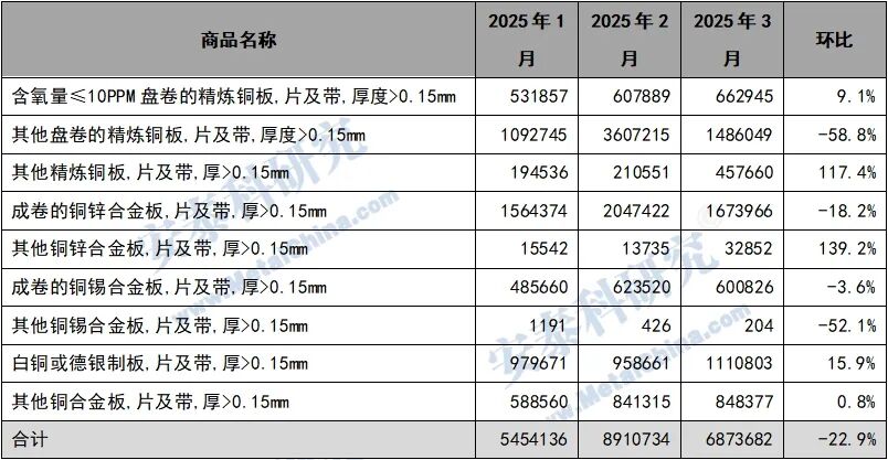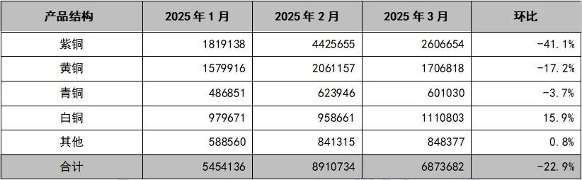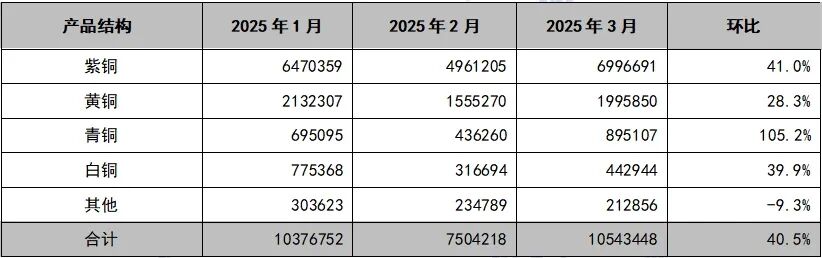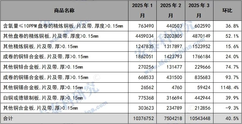 表4 2025年1-3月中国铜板带按产品结构出口量统计 单位:千克