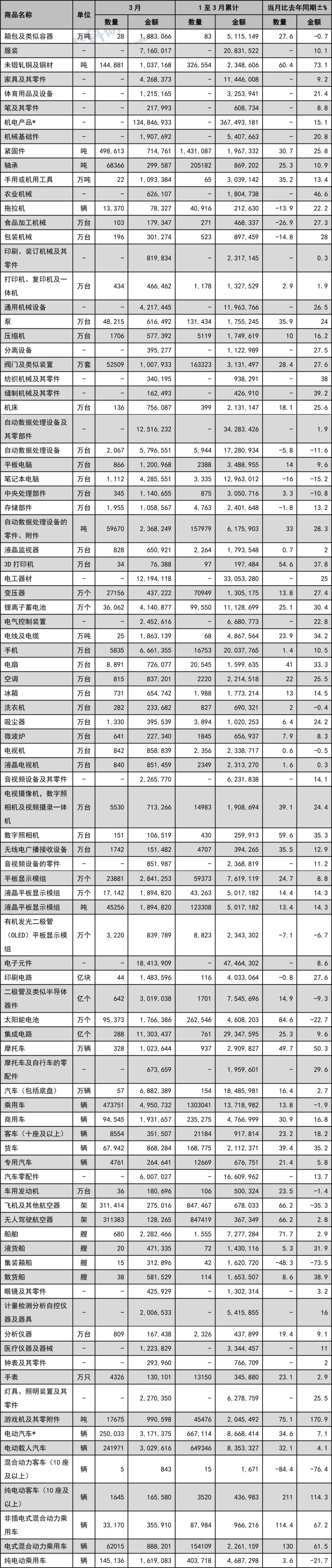 分产品看,3月份,规模以上工业623种产品中有405种产品产量同比增长。其中,钢材13442万吨,同比增长8.3%;水泥15788万吨,增长2.5%;十种有色金属692万吨,增长3.7%;乙烯319万吨,增长6.1%;汽车304.5万辆,增长8.4%,其中新能源汽车129.8万辆,增长40.6%;电力投资保持增长,发电量7780亿千瓦时,增长1.8%;原油加工量6306万吨,增长0.4%。