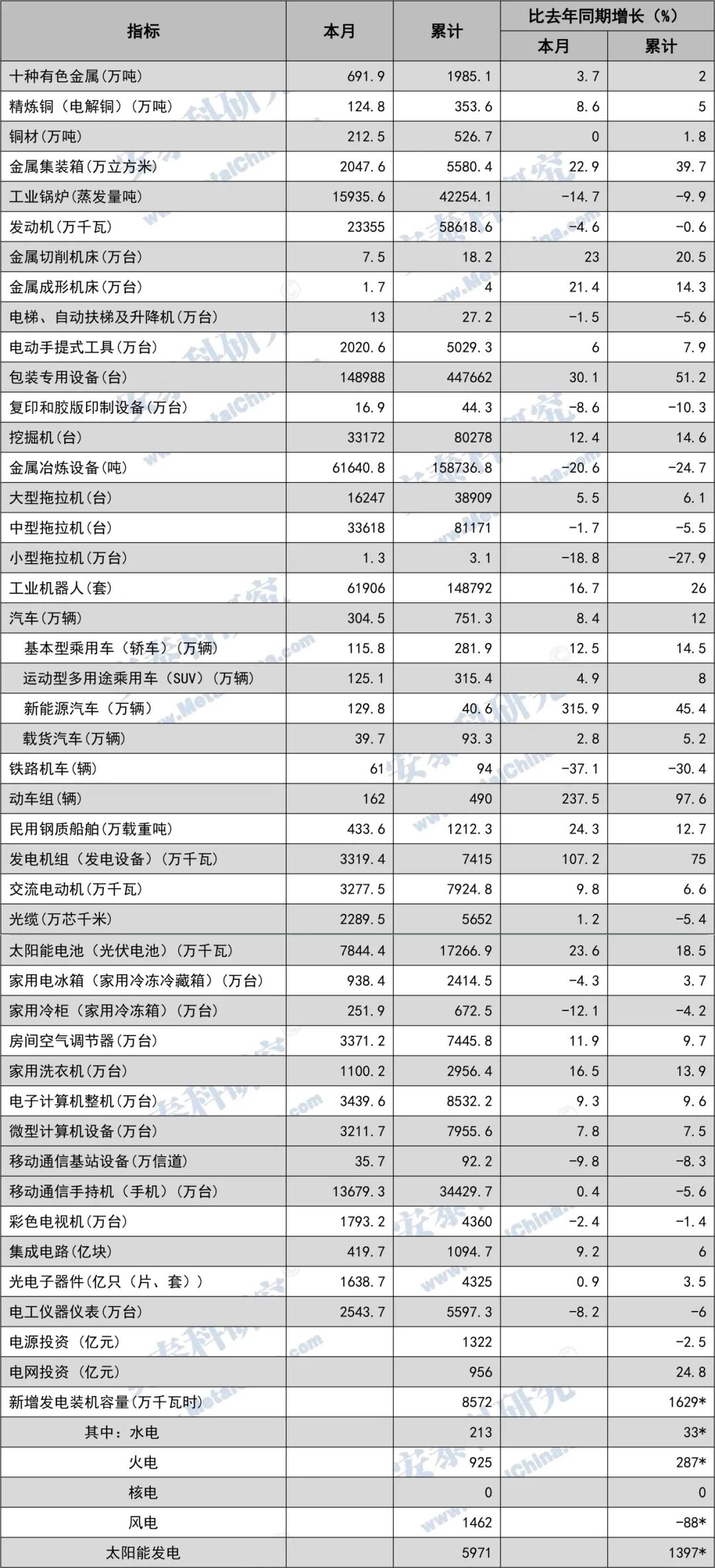分行业看,有色金属冶炼和压延加工业增长6.5%,通用设备制造业增长9.3%,专用设备制造业增长4.7%,汽车制造业增长11.5%,铁路、船舶、航空航天和其他运输设备制造业增长19.0%,电气机械和器材制造业增长13.0%,计算机、通信和其他电子设备制造业增长13.1%,电力、热力生产和供应业增长3.3%。