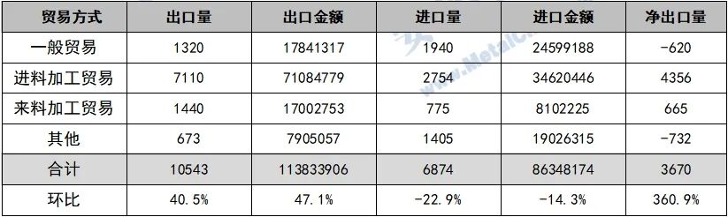 自2024年12月1日我国开始执行出口取消退税政策以来,各企业积极应对并及时调整对外出口贸易方式,在降低企业出口成本的基础上,保持对外出口的力度。从目前来看,“一般贸易”方式对外出口从主为辅已经调整到位,其出口占比大幅下降,而“进料加工”和“来料加工”贸易方式成为我国铜板带的主要出口贸易方式。