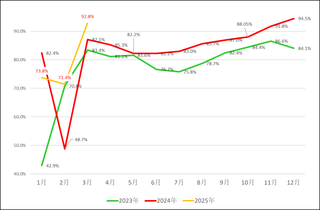 图1 2023-2025年中国铜板带月度产能利用率 单位:%