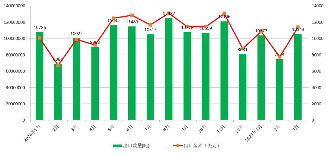 3月,“进料加工贸易”方式和“来料加工贸易”方式的出口量分别为7110吨和1440吨,分别占总量的67.4%和13.7%,“一般贸易”方式出口量为1320吨,占总量的12.5%;净出口量为3670吨,环比增长360.9%。