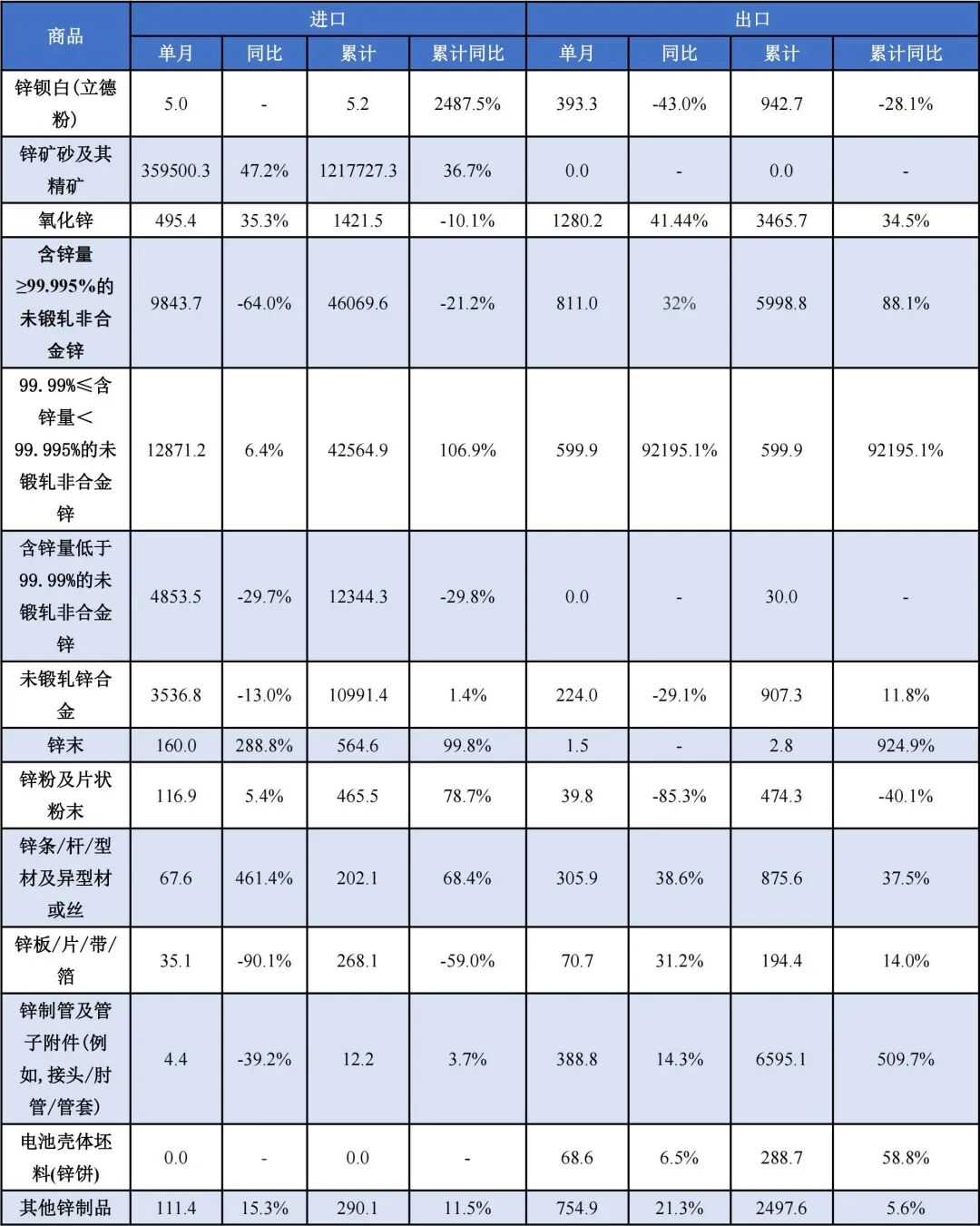 表1 2025年1-3月中国锌相关产品进出口情况(吨)
