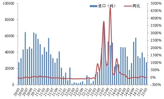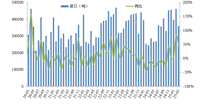 2025年3月进口锌精矿36.0万吨实物量,同比增加46.7%,环比减少22.1%;1-3月累计进口锌精矿121.8万吨实物量,同比增加36.6%。
