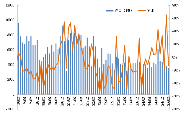 分国别看,1-3月进口主要来自韩国、日本和澳大利亚,进口量分别为2482吨、1446吨和1518吨,同比降幅分别为28.0%、14.7%和28.1%。
