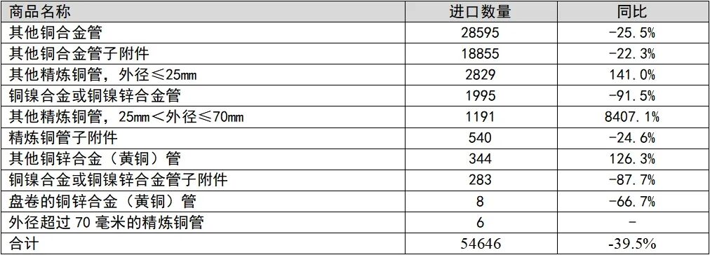 2025年一季度,我国从美国进口铜管54.6吨,同比下降39.5%。其中, “其他铜合金管” 进口数量为28.6吨,同比下降25.5%;“其他铜合金管子附件”进口数量为18.9吨,同比下降22.3%。以上两个产品占总进口量的86.8%。
