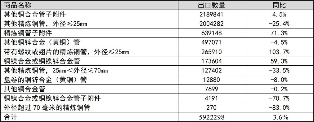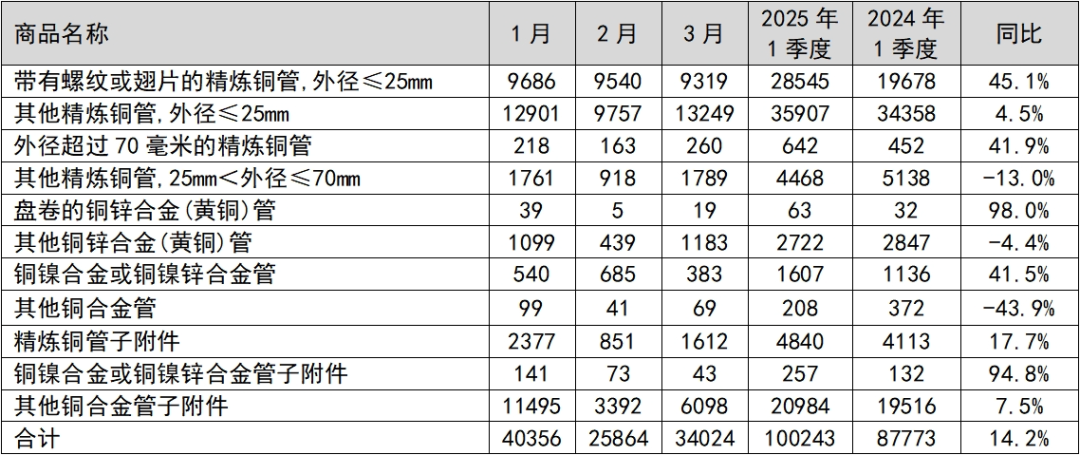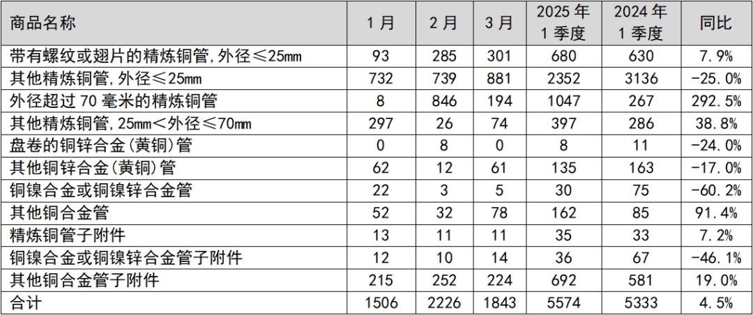 表7 2025年1季度我国出口到美国的铜管产品细分