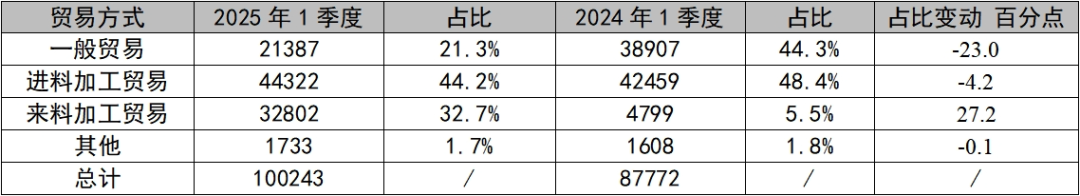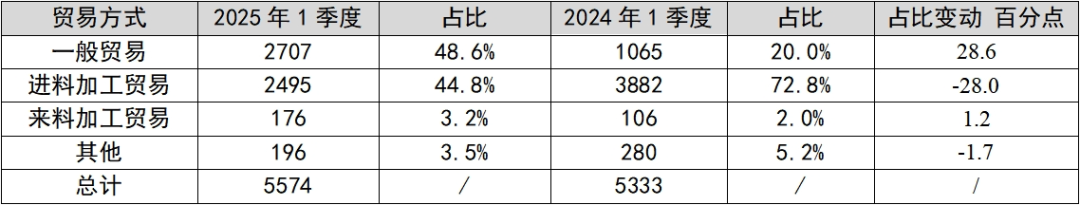从贸易方式来看,一季度,铜管以一般贸易方式进口量为2707吨,占总进口量的48.6%,同比上涨28.6个百分点;进料加工贸易进口量为2495吨,占总进口量的44.8%,同比下降28.0个百分点;来料加工贸易进口量为176吨,占总进口量的3.2%,同比下降1.2个百分点。可以看出,铜管进口贸易方式以一般贸易为主,进料加工贸易方式大幅下降。