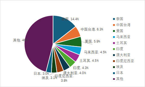 从出口目的地国家/地区来看,一季度,我国铜管出口主要流向东南亚地区。排名前10的地区占总出口量的54.0%。出口到泰国、中国台湾、马来西亚、印度和埃及等亚洲地区的数量同比分别增长27.1%、10.2%、27.9%、28.2%和32.5%。出口到美国的铜管占比为5.9%,较去年同期下降1.1个百分点。