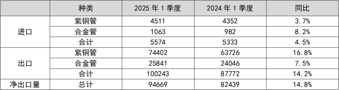 2025年一季度,我国铜管净出口量为9.5万吨,同比增长14.8%。其中进口量为5574吨,同比增长4.5%;出口量为10.0万吨,同比增长14.2%。