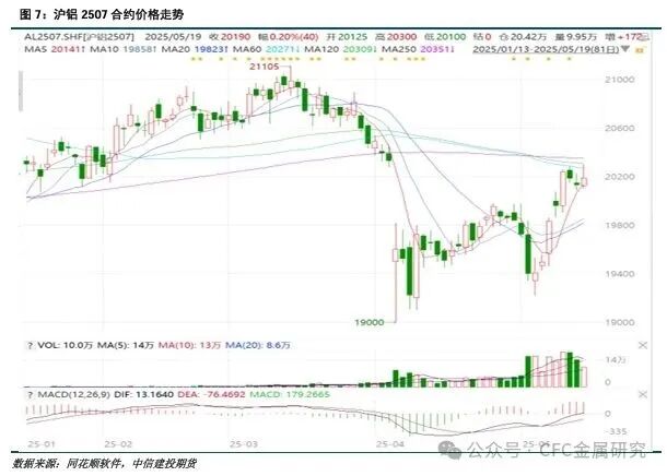 沪铝07合约震荡偏强,价格重心略有提升。周一电解铝社会库存录得较大降幅,在铝价上周小幅下跌后,市场逢低采买意愿较强,现货升贴水保持升水格局。之后中美关税谈判取得一定进展,市场情绪有所改善,铝价偏强运行。周中,国内主流消费地铝锭及铝棒库存继续录得下滑,铝价反弹至20000元/吨上方,下游畏高情绪渐起,按需采购为主。周末几内亚矿端出现扰动,氧化铝期货价格大幅上涨,沪铝冲高回落后小幅收涨,07合约收20170,周涨幅3.23%。