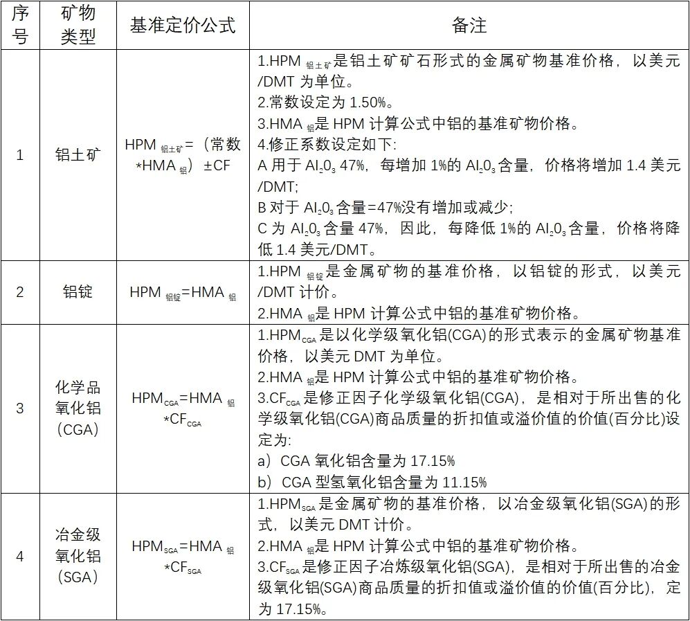 表1:印尼铝产品销售基准价HPM计算方法
