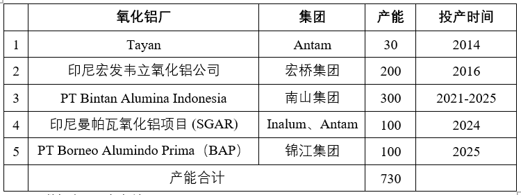 表4:印尼氧化铝企业 万吨/年