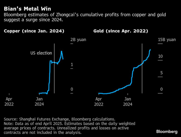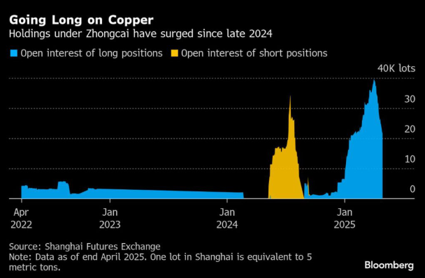 交易所数据显示,从1月初开始,他加快了自己投资和管理基金的购买速度,4月初,在特朗普开始升级关税之前,zhong cai的持仓量达到了接近4万手或20万吨金属的峰值。两位熟悉中财投资的人士说,他后来把经纪公司的部分头寸转移到了芝加哥商品交易所集团(CME Group)旗下的纽约商品交易所(Comex),以捕捉美国的动荡局势。根据彭博社的计算,截至 4 月底,中财的铜赌注共产生了约 2 亿美元的利润。