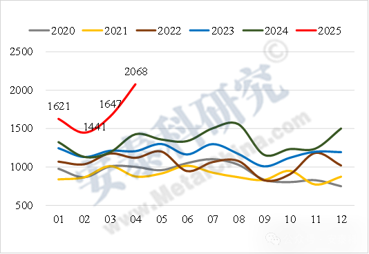 一、铝土矿进口环比增长。2025年年初以来,受自几内亚进口大幅增长拉动,中国铝土矿进口不断突破新高。4月份铝土矿进口2068万吨,环比增长25.6%,同比增长45.4%。其中,自几内亚进口1673万吨,环比增长28.7%,同比增长59.6%,主要是几内亚在雨季前加大发货量所致;自澳大利亚进口268万吨,环比增长5.7%,同比下降14.5%。铝土矿进口单价结束连续八个月的上涨态势,4月份均价92.0美元/吨,环比下降1.1%,同比增长40.6%。