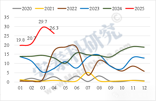 图4 2020-2025年我国铝合金月度进口量(万吨)