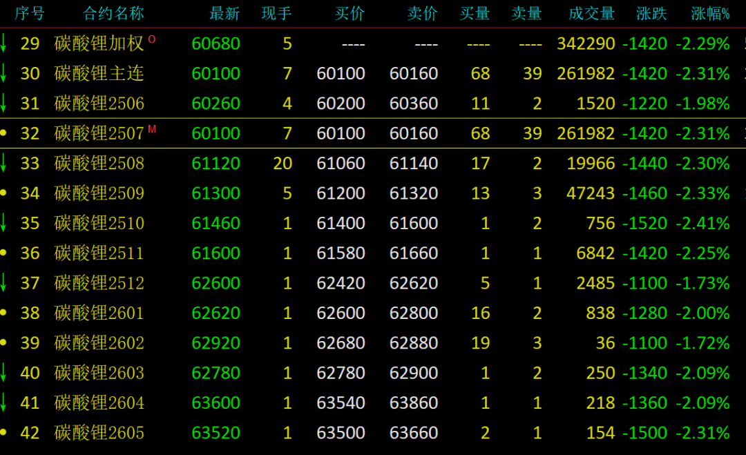 5月26日,碳酸锂期货主力合约LC2507盘中跌破60000元/吨关口,下探至59920元/吨,随后小幅回升,报收60100元/吨,当日跌幅为2.31%。