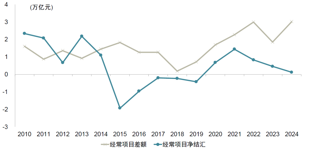 在美元走弱的背景下,过去几年积累的经常项目顺差如果结汇提速,也可能支撑人民币汇率升值。2020年以来,我国外汇储备维持在3.2万亿美元左右,并未出现明显增加。净结汇与贸易顺差从2022年开始出现偏离(图表15)。