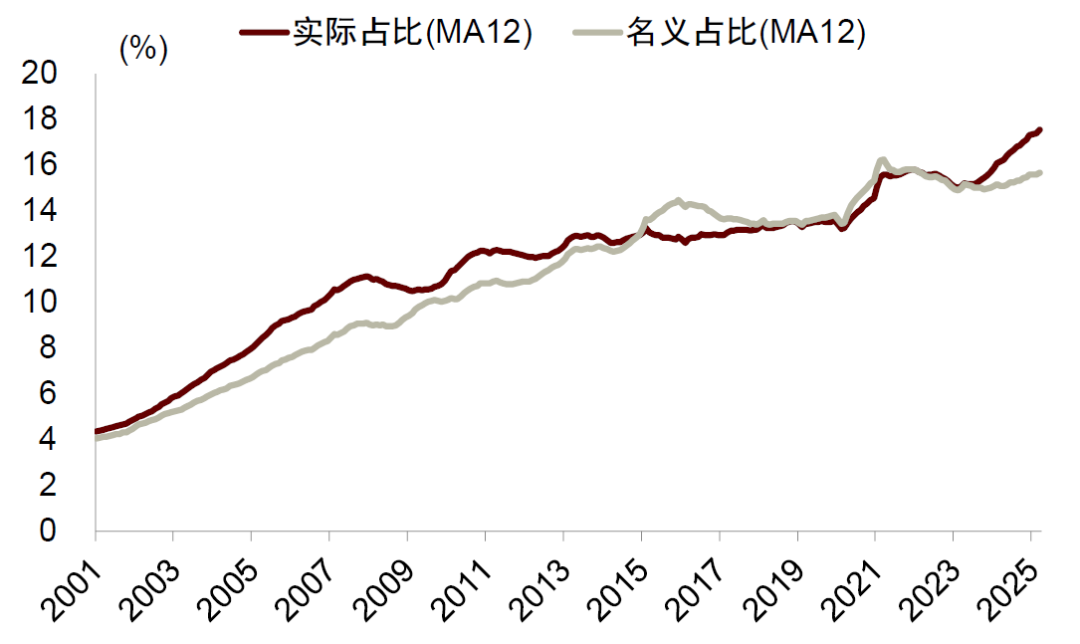 我国主要贸易伙伴物价走强,既有政策刺激因素,也有全球供应链调整的因素。比如,2020年后美国联邦政府进行了大规模的财政刺激,2020年、2021年的财政赤字率分别达到16%和11%。2022年拜登政府签署《通胀削减法案》与《科学与芯片法案》,回归产业政策,财政继续扩张。2025年5月,特朗普政府提出的“大美丽法案”(one big beautiful bill)在众议院获得通过,将在未来10年大幅提升美国财政赤字。同时,过去几年美国金融周期处于上行阶段,房价在2020年之后加速上行,也推升通胀水平。