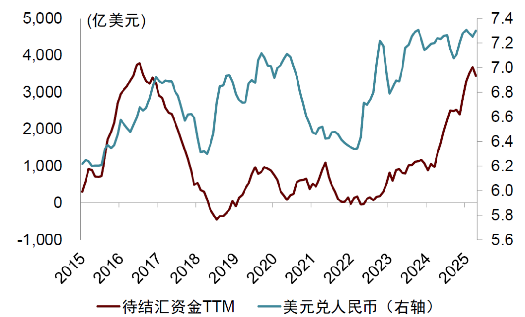 历史上,银行涉外代客外币收入增加,人民币汇率通常升值,而从2024年以来,两者偏离程度加大,可能反映私人部门结汇意愿偏弱,部分对外收入并未转换成人民币(图表16)。将银行代客涉外净收入减去银行代客净结汇,可以近似等于待结汇资金。历史上,待结汇资金增加,人民币通常有贬值压力。可以看到,2024年以来待结汇资金上涨较快,部分解释了人民币下行(图表17)。