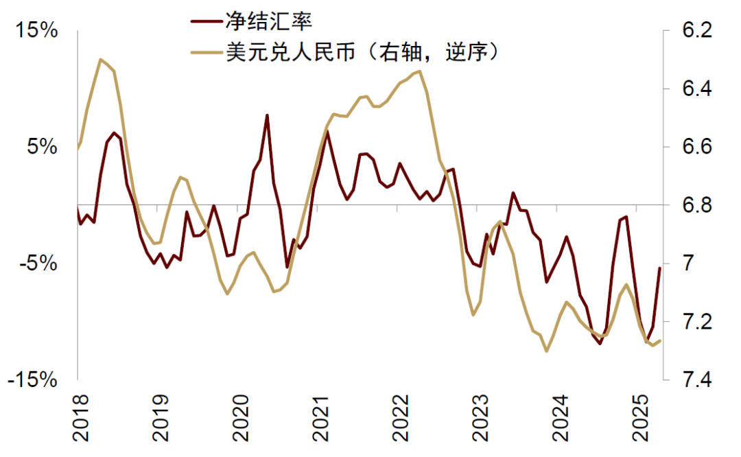 我国金融周期调整趋缓,而技术进步提速,资本项下贬值压力可能减少,也可能增加资金结汇动机。2025年4月,70个大中城市的新建住宅价格指数同比下降4.6%,二手住宅价格指数同比下降6.8%,跌幅均较2024年下半年收窄。金融周期调整放缓后,加上技术进步提速支撑市场信心,资本项目对人民币的压制可能减小,可能导致资金结汇提速。
